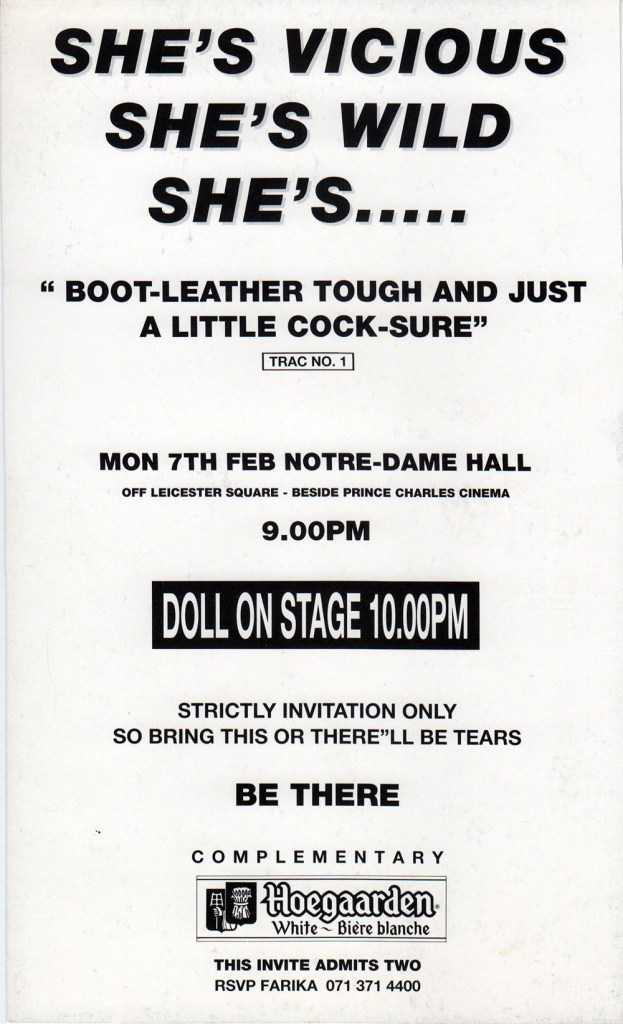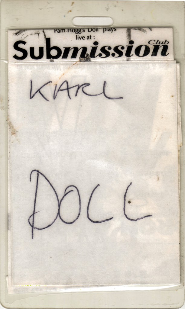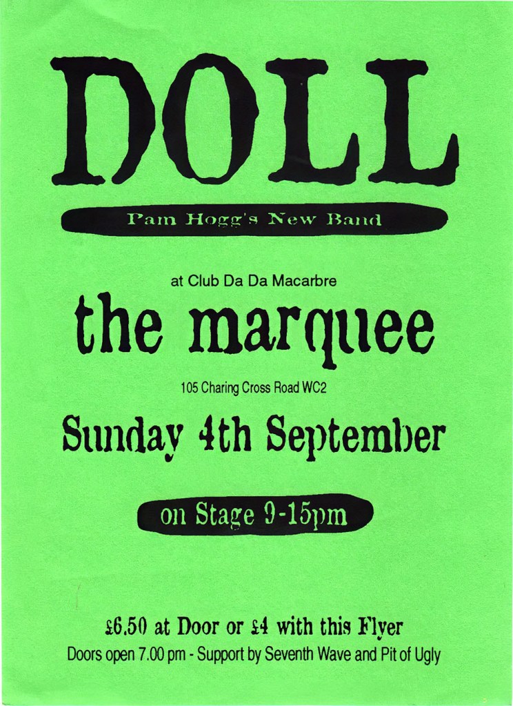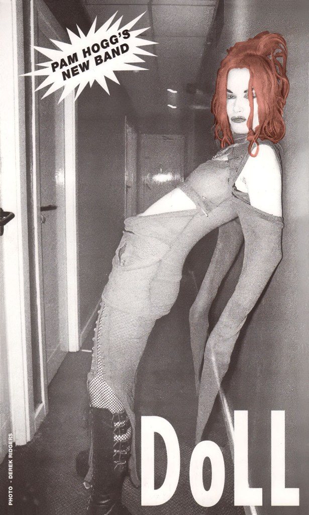Doll was created by Robert Courtney and Pam Hogg following a limousine ride won at a Richard Branson Party on Oxford Street. Robert had been recording new tracks (so far just instrumentals) and asked Pam if she would like to sing on them and did she have any lyrics. Pulling some paper from her pocket she said yes and by the end of the night there was the beginnings of a set recorded in demo form that, after some hastily organised rehearsals with band members Sean McLusky (Subway Sect/Jo Boxers) on drums and Karl Leiker (Hyperhead) on bass, they would perform five days later supporting Debbie Harry on her UK tour. The name Doll comes from their shared love of the New York Dolls.